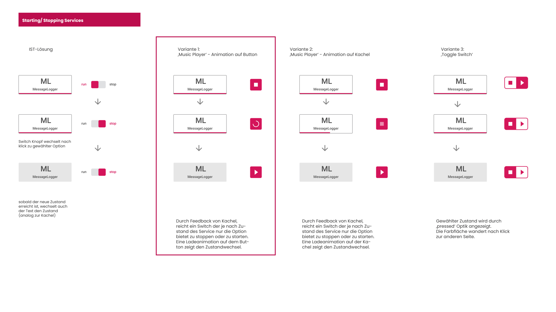 I used low-to-high-fidelty wireframes to conceptualise and design components. I always created multiple concept variants and discussed advantages and disadvantages of different approaches with the team. After internally agreeing on concept favourites, I steadily refined them. Afterwards, I created handoff documents and consulted with developers to ensure that the design was implemented in detail. The components went through several iterations until the final implementation.